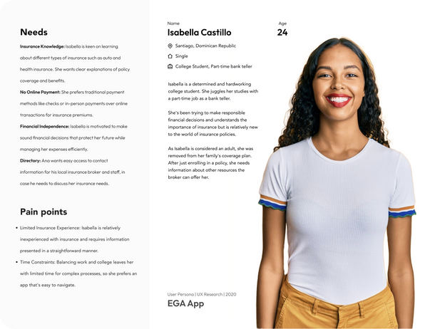 I used a variety of tools and methods to conduct extensive research and understand the country's users and audience. Data was collected by polls, Google forms, and in-person short surveys while consumers visited the company's offices. A solid user and persona research study helped determine the UX path used to design the app's interaction and to ensure success while meeting the business goals. The following are key user personas based on research.